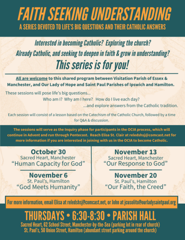 6:00 pm (Doors open after Mass) to 9:00 pm