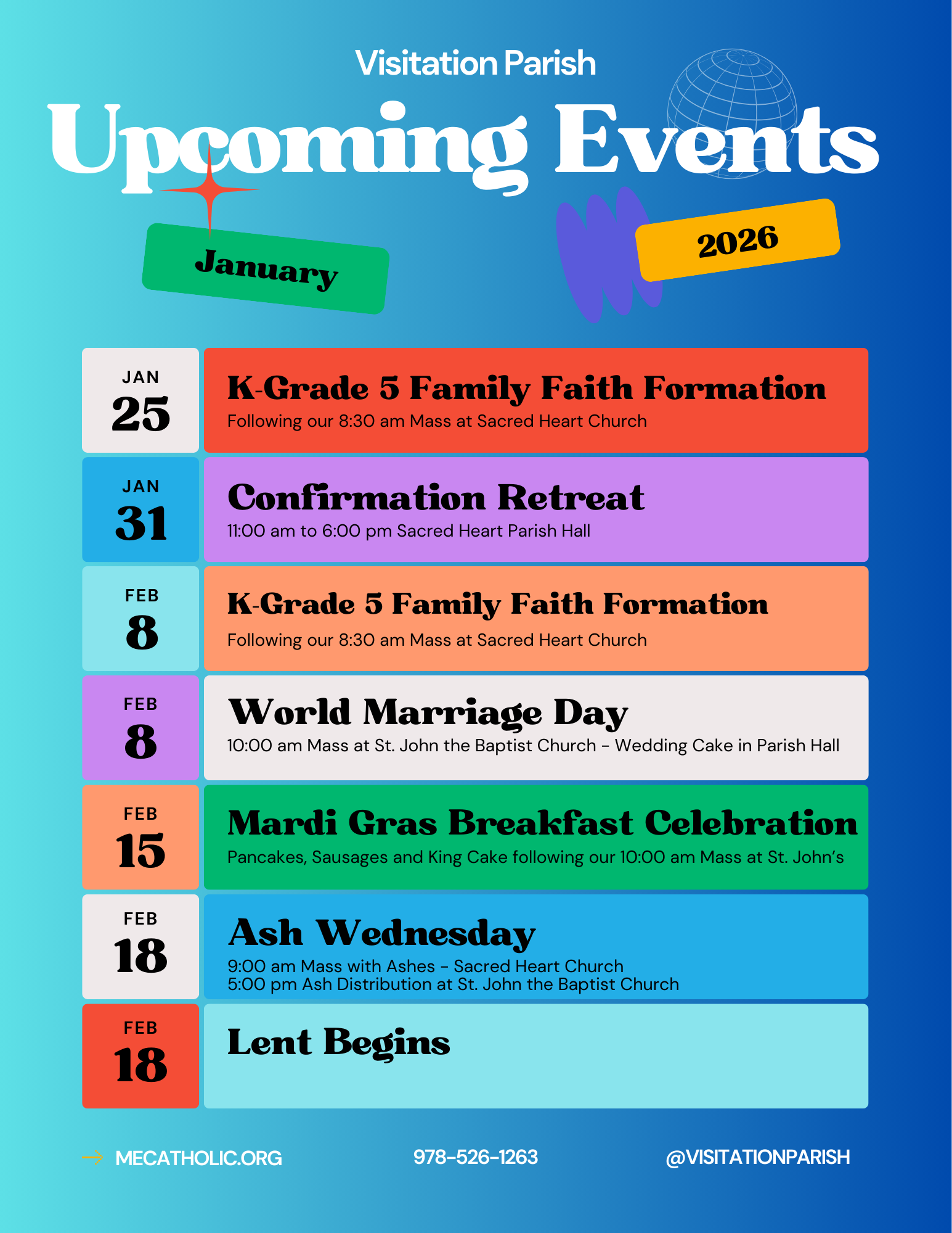 At Visitation Parish, our parish bulletins are your go-to source for the latest news, events, and inspiration. Each week, we share important updates, spiritual reflections, and opportunities to connect with our vibrant community. Stay informed and engaged with us!