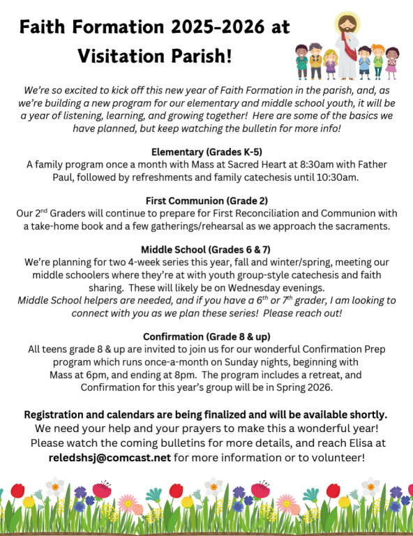 Please fill out this form in its entirety, and we'll reach out to you to confirm. We are looking forward to a wonderful year with our students and families! Please call the Faith Formation office with any questions: 978-526-1781, or email reledshsj@comcast.net. Thanks and God bless!!